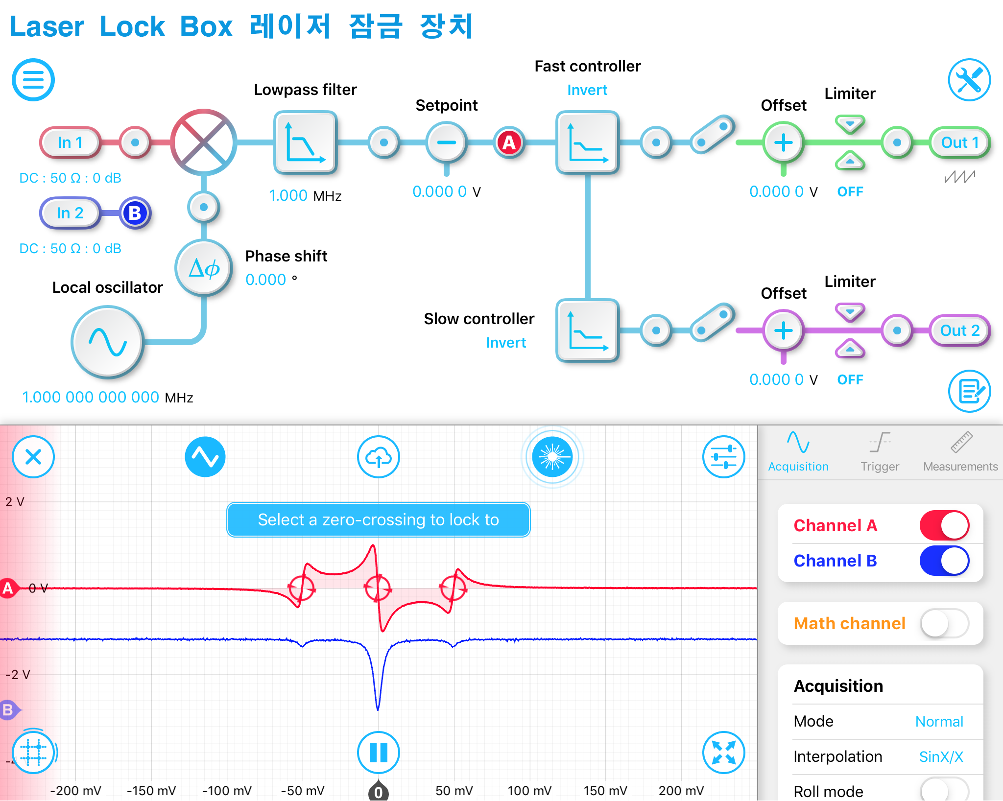 하드웨어에는 재구성 가능한 소프트웨어가 필요합니다. Moku:Lab의 iPad 응용프로그램은 각 인스트루먼트에 맞게 특별히 최적화된 사용자 인터페이스로 실험 구성을 사용하기 쉬운 iPad의 스크린 터치로 설정값을 간단하게 조작할 수 있고, 실험의 각 단계별 신호의 파형을 각 포인터 마다 확인 할 수 있는 기능을 제공합니다.